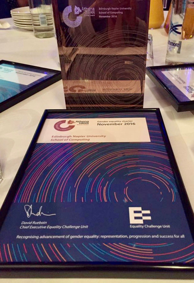 Yesterday’s ceremony celebrated those who made successful Athena SWAN award submissions in November 2016. My colleague Dr Laura Muir led the work of the SoC Athena SWAN self assessment team (SAT), and Alistair Stupart and Dr Kate Durkacz led that of SEBE. I served on both SATs in my capacity of Edinburgh Napier University’s institutional Academic Champion for Athena SWAN.