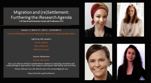 Rachel is also participating in an iConference workshop entitled Migration and (re)settlement: furthering the i-research agenda. This takes place over two days: all day on 27th March 2021, with follow-up on Wednesday 31st. Here researchers and professionals from the information fields and related disciplines will reflect on their research on migration and (re)settlement, with an emphasis on information practices, ICT use, and forms of engagement and learning. The aim of the workshop is to develop the research agenda so that it adopts a participatory, migrant/refugee-centred approach. Rachel‘s main contribution to the workshop will be a lightening talk in a session entitled ‘Current challenges in forced migration research: capturing narratives’. To find out more about this, please see the post Ethics and research on the PhD musings section of Rachel’s web site Librarian sans library.