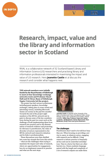 Other RIVAL dissemination activities are the presentation that my colleague Dr Bruce Ryan will be giving at the CILIPS conference on Tuesday June 8th 2021, and an article by another team of RIVAL members that was published in the March 2021 issue of Information Professional.