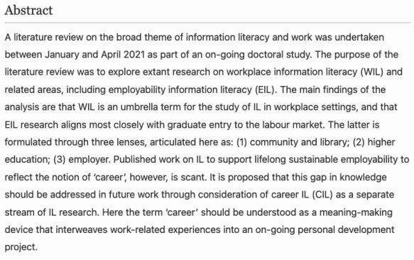 Selected papers from the European Conference on Information Literacy 2021 (ECIL2021) are now available in a set of conference proceedings published by Springer. Amongst these is the conference contribution co-authored by Edinburgh Napier University colleagues Marina Milosheva, Hazel Hall, Pete Robertson, and Peter Cruickshank on career information literacy (CIL), and distinctions between CIL and the concepts of workplace information literacy (WIL) and employment information literacy (EIL).